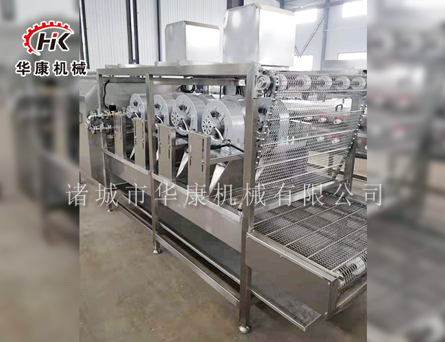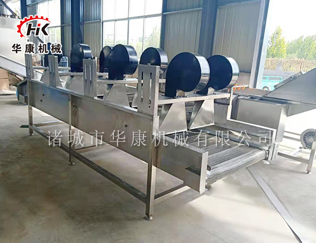 蔬菜清洗翻转式风干机采用常温强流风的作用,去除蔬菜清洗后表面的水分,该机采用连续间断式物料输送系统,使物料进行平稳运行,在物料输送过程中,通过间断的网带输送速度差别及高度差别,实现物料的均摊和翻转,达到各个表面的受风均匀性。即避免了人工除水的不确定性和二次污染,又避免了高温工艺产生的对产品加温缺点。