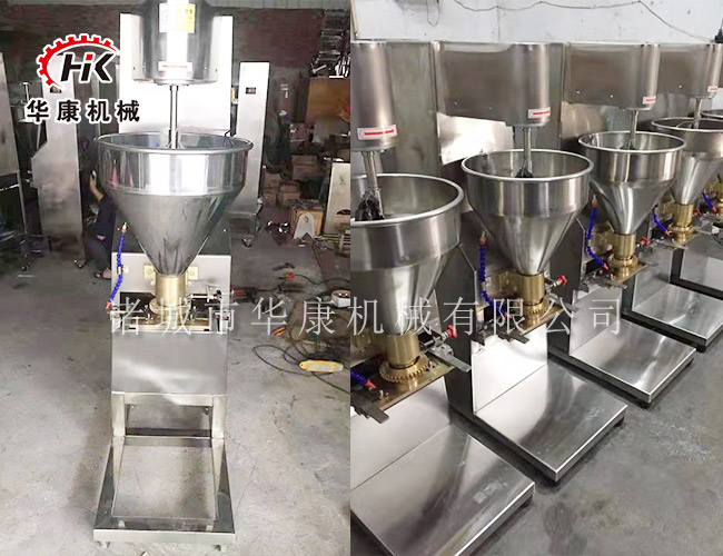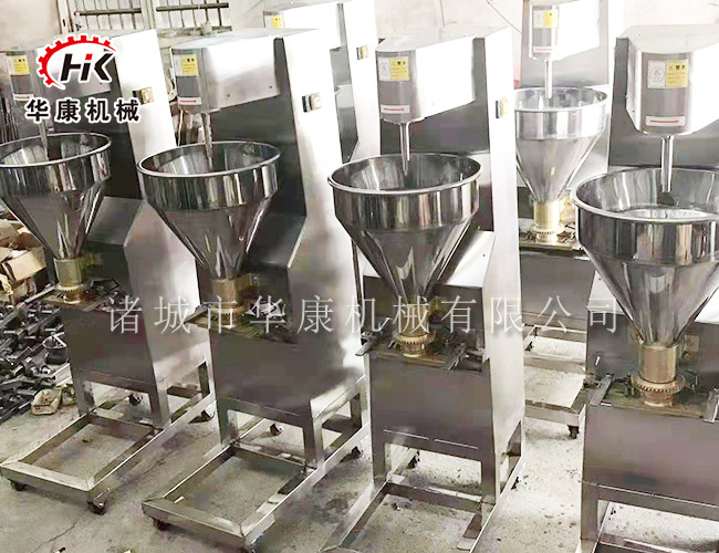 肉丸机一般由绞肉机、打浆机、成型机组成。根据所做肉丸的肉类不同,打浆又分为高速打浆机和慢速打浆机。以做猪肉为例,先浆肉清理好,通过绞肉机绞成肉碎。再放入高速打浆机内打成肉茸,然后放入成型机内制成圆形物。包心肉丸机选用不锈钢材质,丸子直径18-25mm和25-35mm两种,内包馅料的多少能自由调节,可以制作各种爽脆,有韧性,有弹性的包心肉丸,包心鱼丸等。
